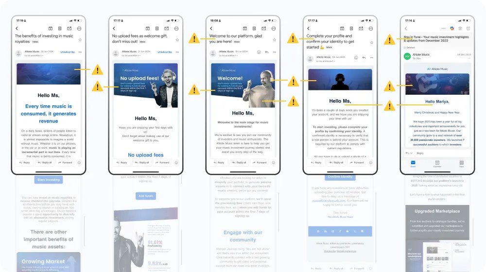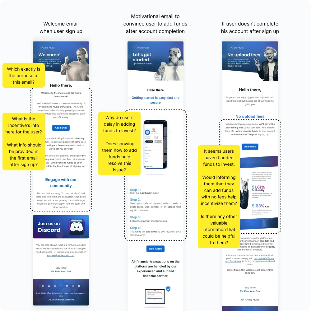 ANote Music is a platform that enables users to invest in music catalogues and earn monthly royalties. A usability test revealed that users were not fully engaging with the product, primarily due to a lack of understanding at multiple touchpoints, including the website, platform, and unclear email communication.