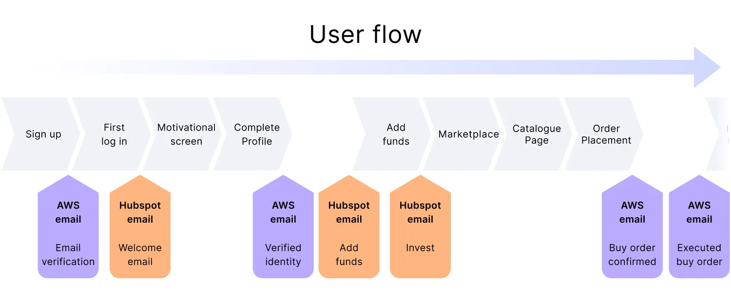 To ensure emails were sent at the right time with the right message, I visualized the user journey inside platform alongside: