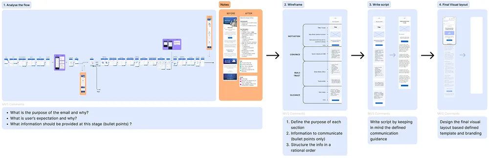 I began with a deep analysis of the current email flow to identify friction points and content gaps. It became evident that aligning user expectations and understanding during their journey inside the platform was critical as the existing email workflow was no longer aligned with the user journey.