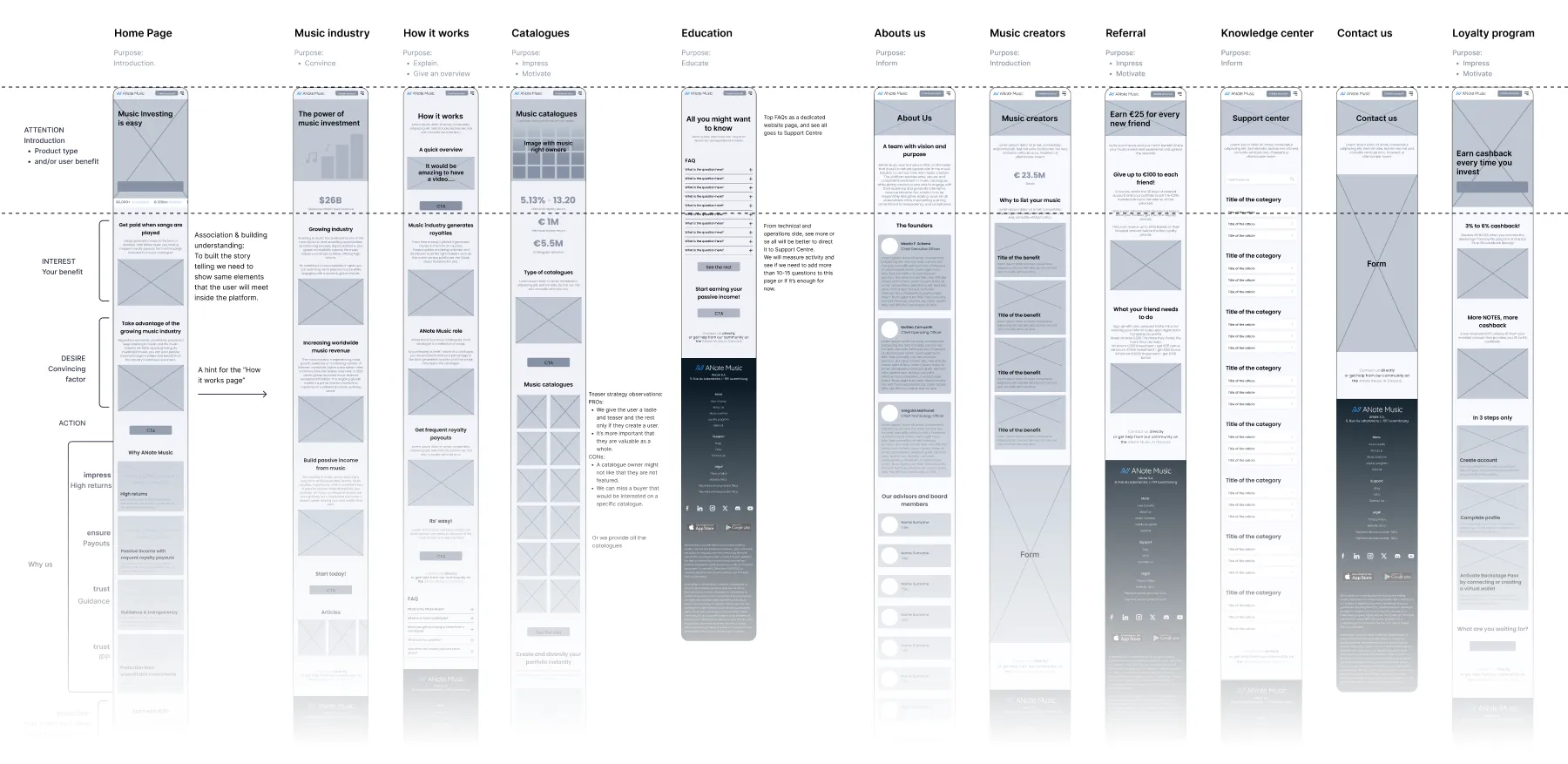 Secondary pages (e.g., Rewards, Music creators, Support center articles, Legal) were moved to the footer to declutter the main navigation while remaining accessible. This allowed us to focus the core user flow on educating and onboarding new investors.